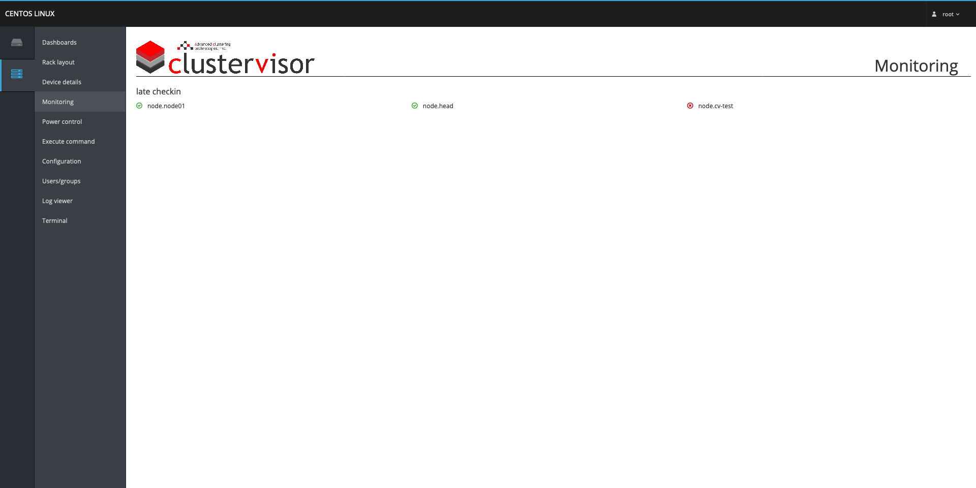 This same window is not just accessible from the Dashboard page, but can also be accessed from the Rack layout page by clicking on the names of the nodes presented or from the Device detail page by selecting the desired node from the Device drop-down menu. As well, the status of the monitored stats under the Monitoring tab mentioned earlier can be found on the Monitoring page, but will display the status for all the nodes in the cluster.