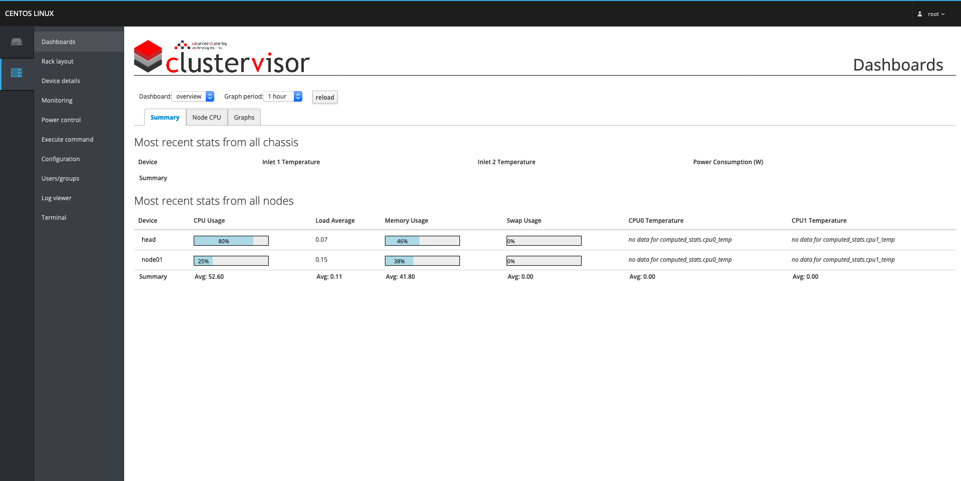 When ClusterVisor is first opened, it will display the Dashboard page that provides a way to monitor the general state of the cluster at a glance. Under the Summary tab on this page, all of the nodes in the cluster will be listed alongside their most recent stats. If any of the nodes stats have crossed a critical threshold, the node's name in the Device column will be highlighted in red to make problematic nodes easy to distinguish among the other nodes.