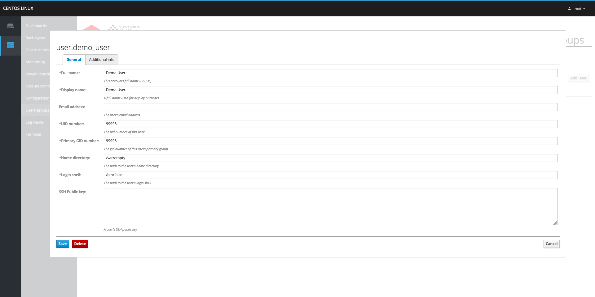 The non-required fields do not need to be filled out and are presented only as a convenience. For this reason, the fields under the Additional Info tab can be ignored in most cases. However, it should be noted that the non-required field SSH Public Key under the General tab will also serve the purpose of allowing the user to login via SSH regardless of whether the /home directory is mounted on the system or not. Usually this is not the case since a user's SSH public key is typically stored under the .ssh directory in the user's home directory (so it is no longer present if the /home directory is not mounted).
