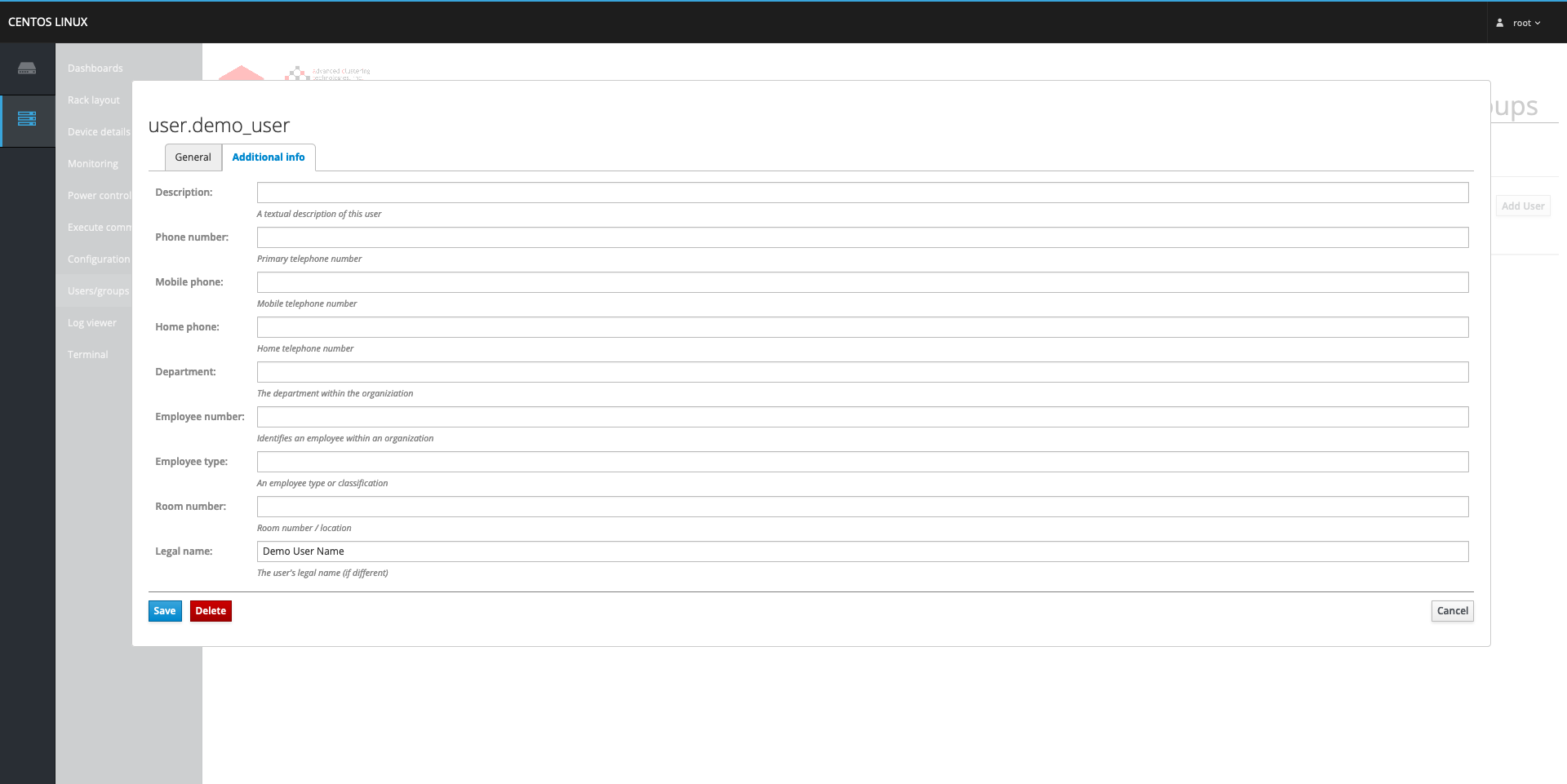 From the Users tab, above the listed entries of users is an input box to the left of the Add User button. In the input box, put in the desired username for the new user and click on the Add User button. This will present a pop-up window with two tabs, General and Additional Info, and in both tabs all fields that are prefixed with an asterisk ( * ) are required fields that need to be given a value for the user to be added. Some of those fields will be automatically filled out with sane defaults, so unless there is a necessity to change them they can be left as-is.