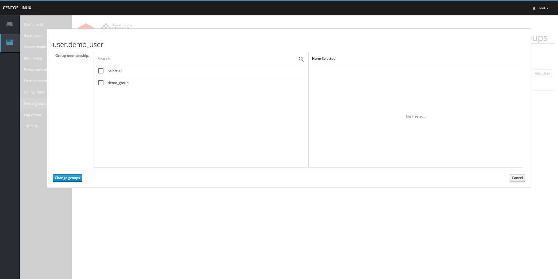 A user can be added/removed from a group in two different ways in ClusterVisor, either from the Users tab or the Groups tab. To do so from the Users tab, in the Actions column for each user is a Groups button, and clicking it will bring up a pop-up window to select which groups to add/remove from the user. To do so from the Groups tab, clicking the Edit button from a group's Action column will bring up a pop-up window to select which users to add/remove from the group.
