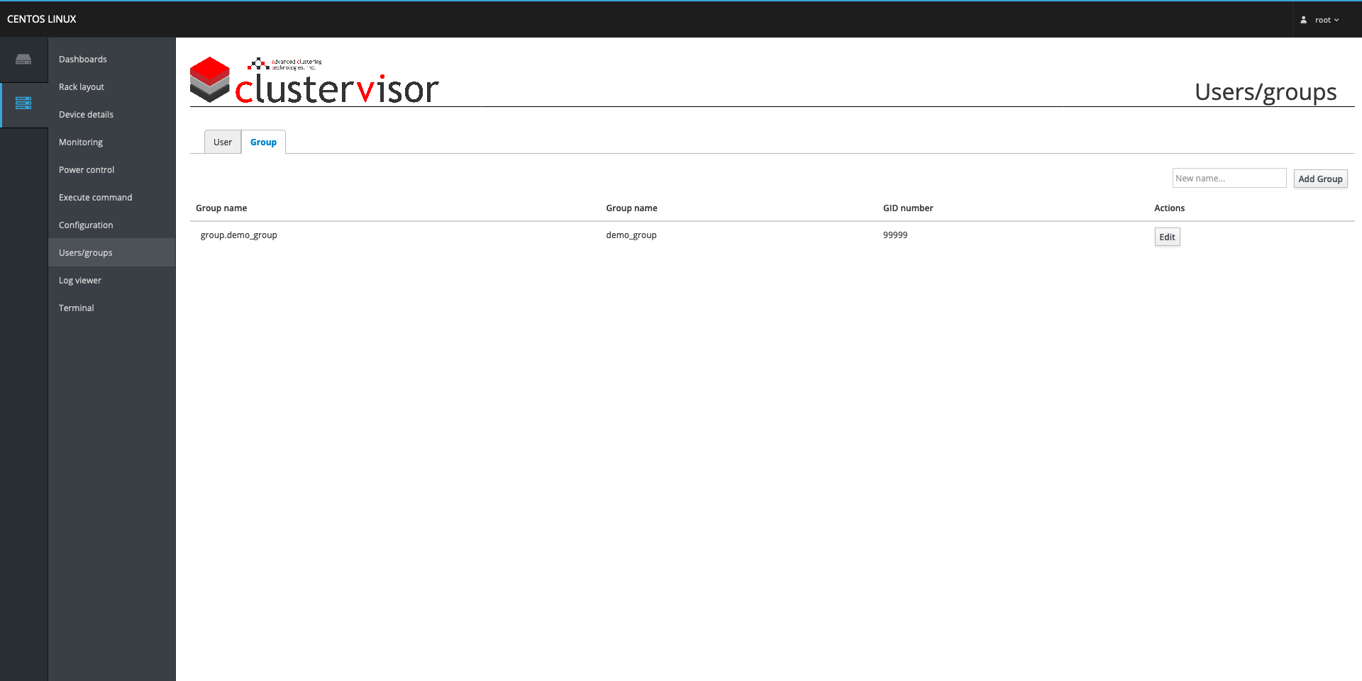 If ClusterVisor was installed with its full suite of features, it installs and sets up an LDAP server (specifically, a 389 directory server) to use for managing users and groups across the cluster. The page in ClusterVisor to manage the users and groups can be found under Users/groups and behaves much like Configuration page. The Users/groups page has two tabs, Users and Groups, and in this section all actions for users and groups will be occurring in those two tabs.