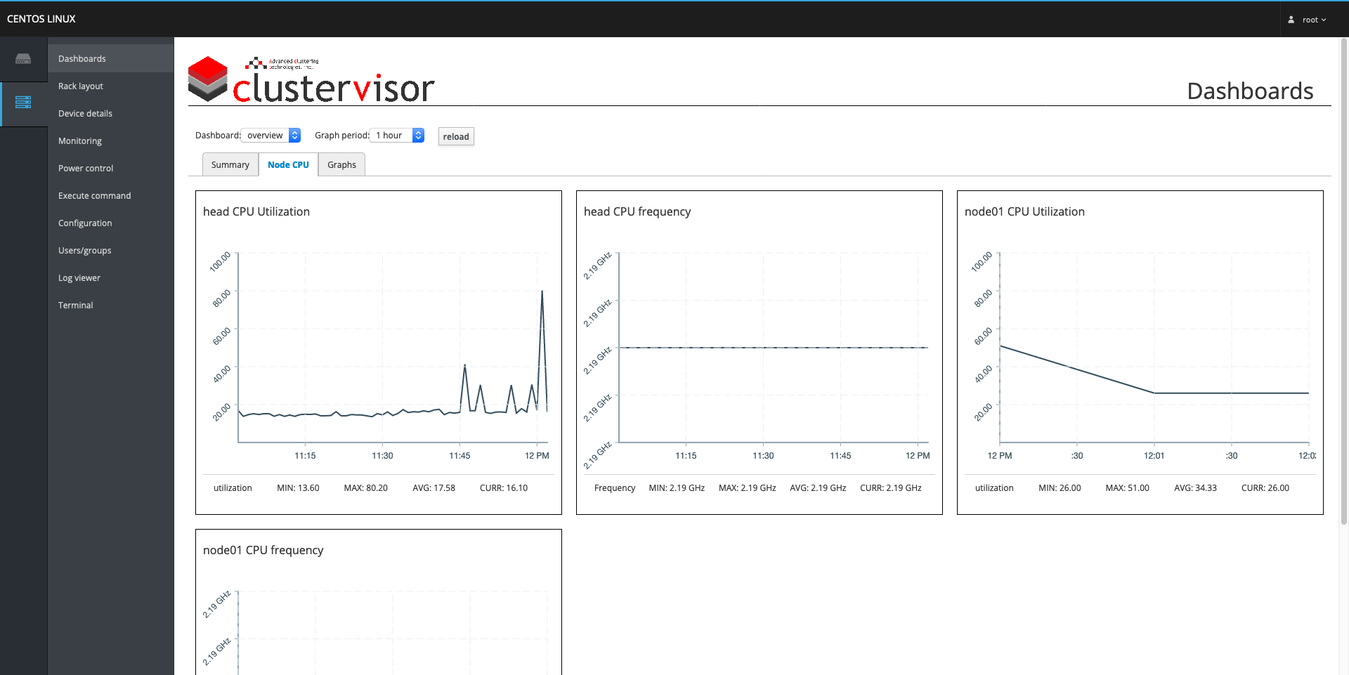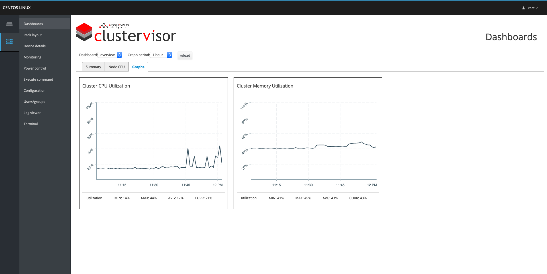 While the graphs are exclusively available in the web interface, the stats for the nodes can be queried from the command line using cv-stats. By default, the stats of the node(s) will be listed in brackets with the node names listed below beside the value of each stat. As well, the status of the monitored stats can be queried from the command line using cv-monitoring, and is displayed by default in the same form as cv-stats.