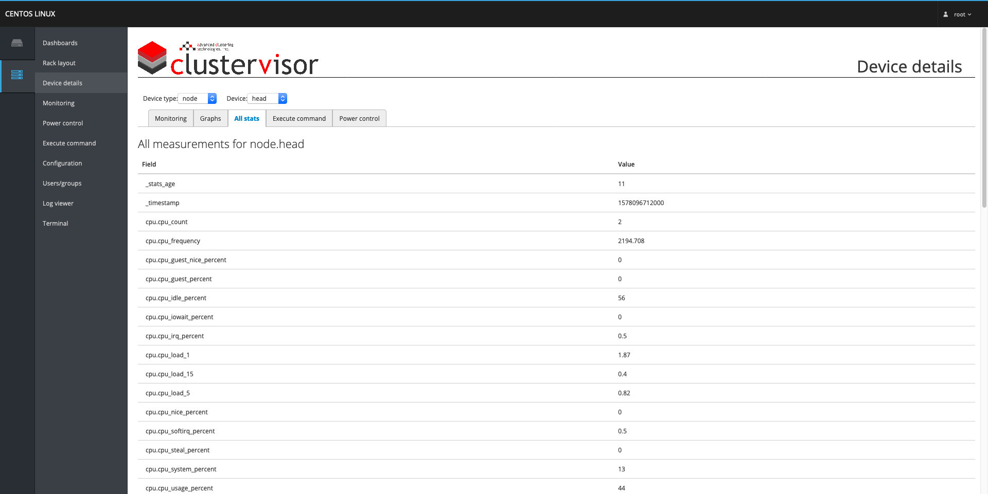 - All stats - This lists all of the current values of the stats that ClusterVisor collects.
