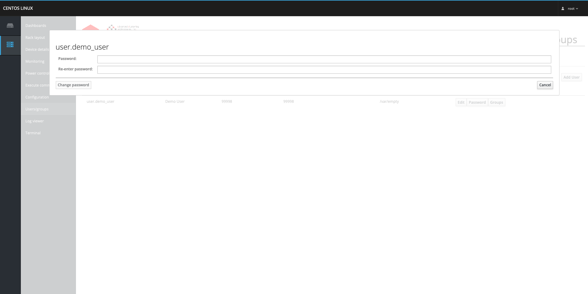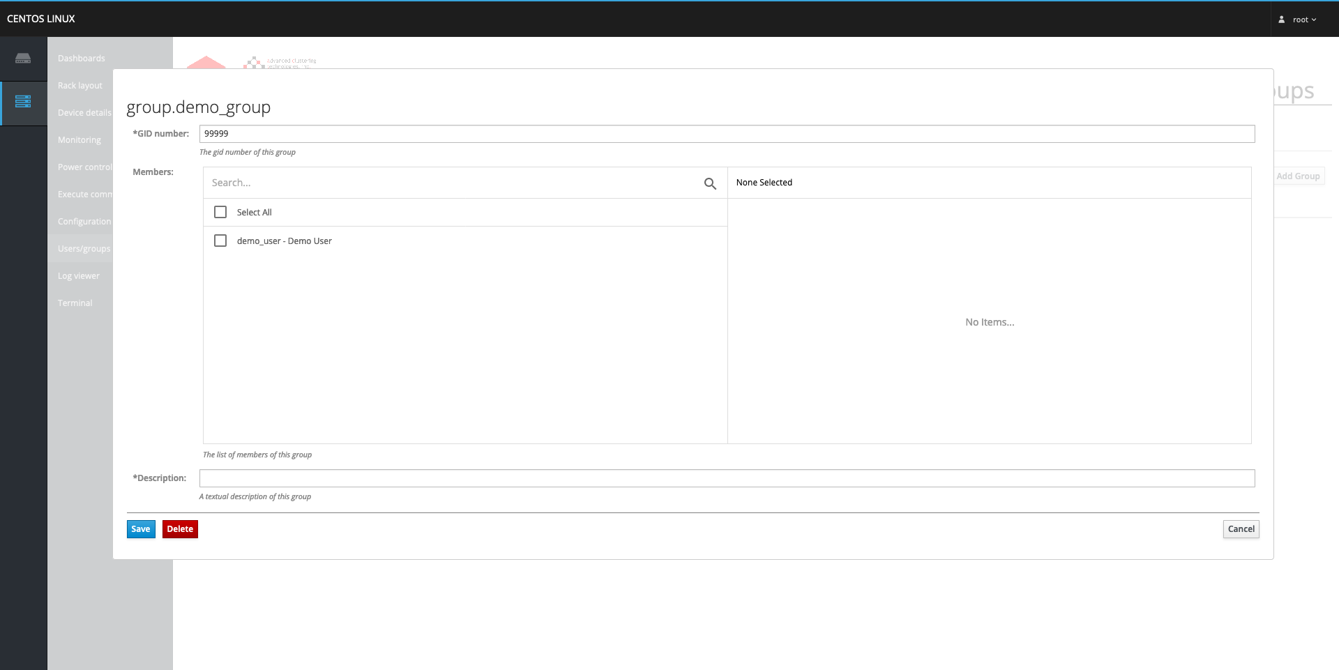 If ClusterVisor was installed with its full suite of features, it installs and sets up an LDAP server (specifically, a 389 directory server) to use for managing users and groups across the cluster. The page in ClusterVisor to manage the users and groups can be found under Users/groups and behaves much like Configuration page. The Users/groups page has two tabs, Users and Groups, and in this section all actions for users and groups will be occurring in those two tabs.